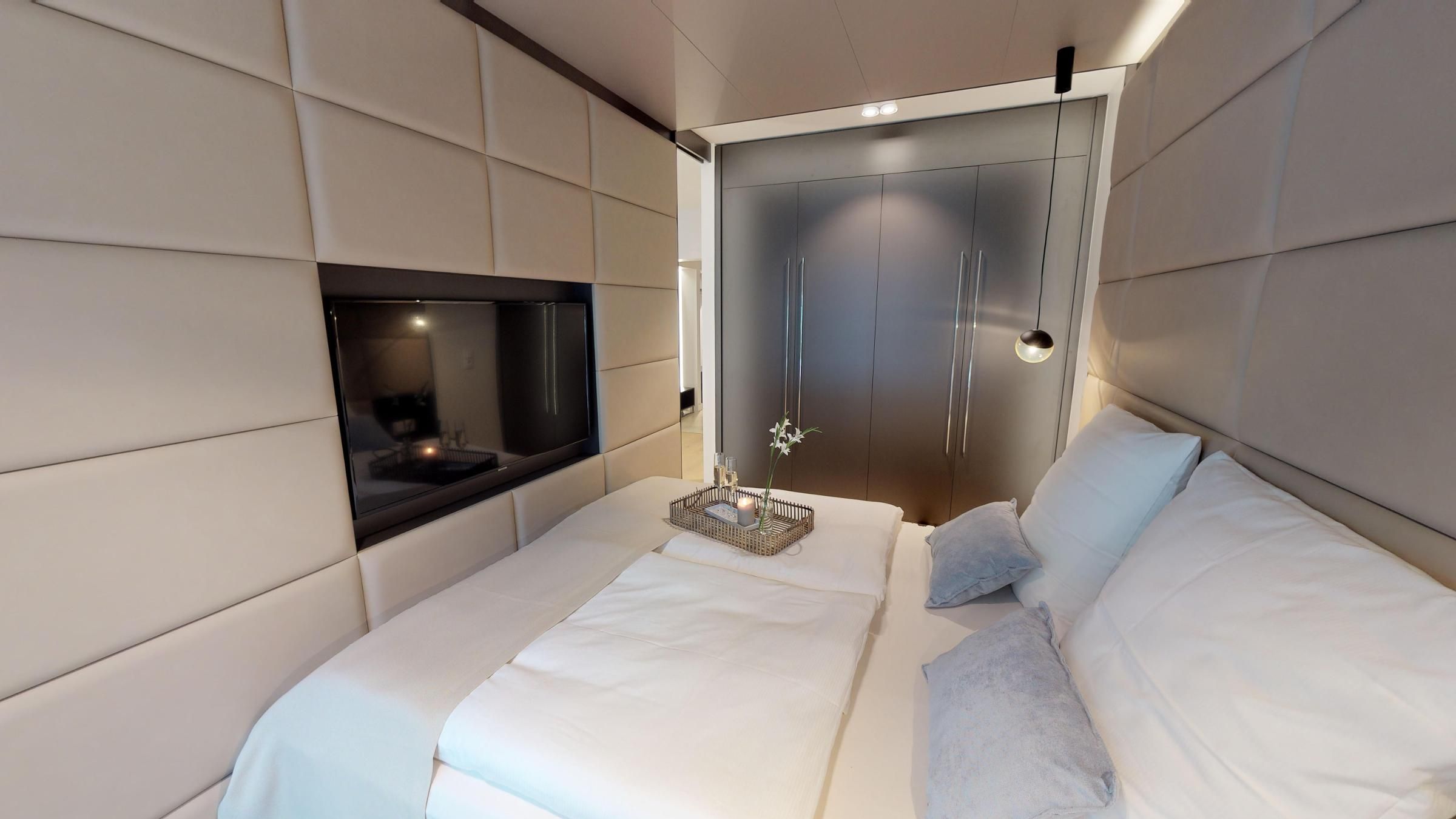 Es erwartet Sie eine gut ausgestattete Küchenzeile mit einer kleinen Essecke im Wohnbereich. Des Weiteren gibt es ein modernes Bad mit Dusche. Abgerundet wird der offene Wohn- Essbereich durch zwei Sessel. Das separate Schlafzimmer mit Boxspring-Doppelbett wird durch Lamellen-Schiebetüren abgetrennt.