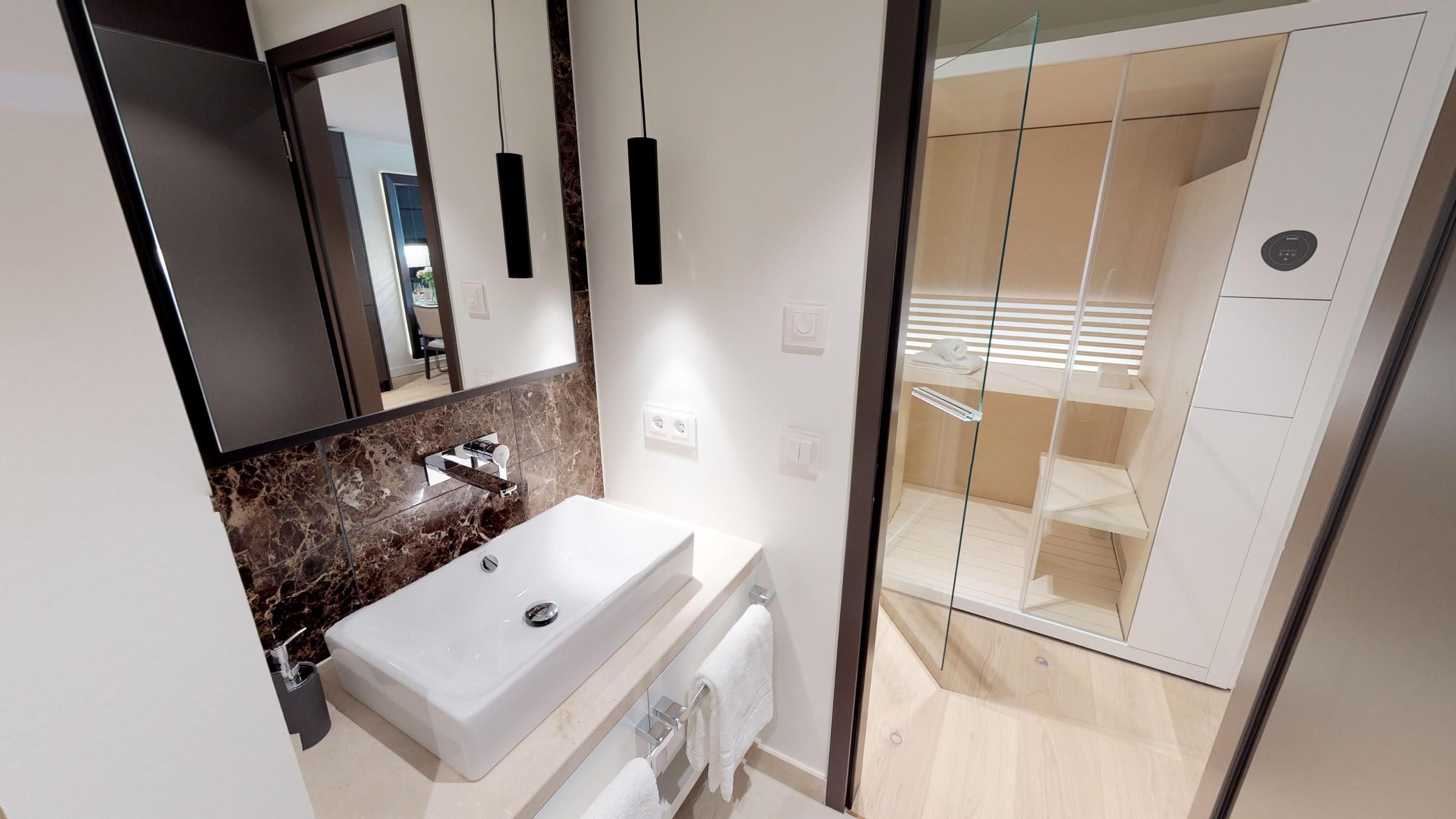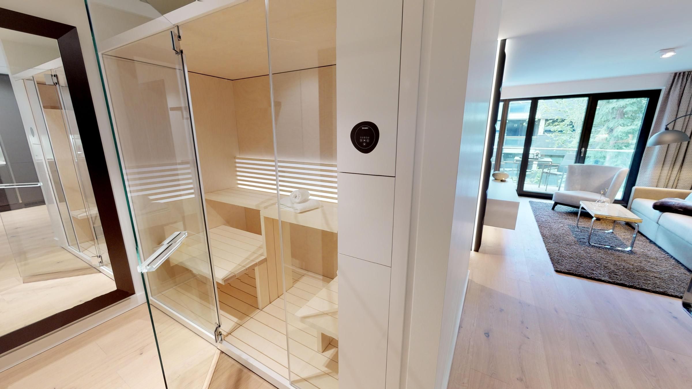Highlights des Apartments sind die eigene Sauna (2,37m × 1,19m) sowie der möblierte Balkon mit Sonnenliegen, der entspannte Stunden an der frischen Luft ermöglicht! Zur Wohnung gehört ein Tiefgaragenstellplatz.