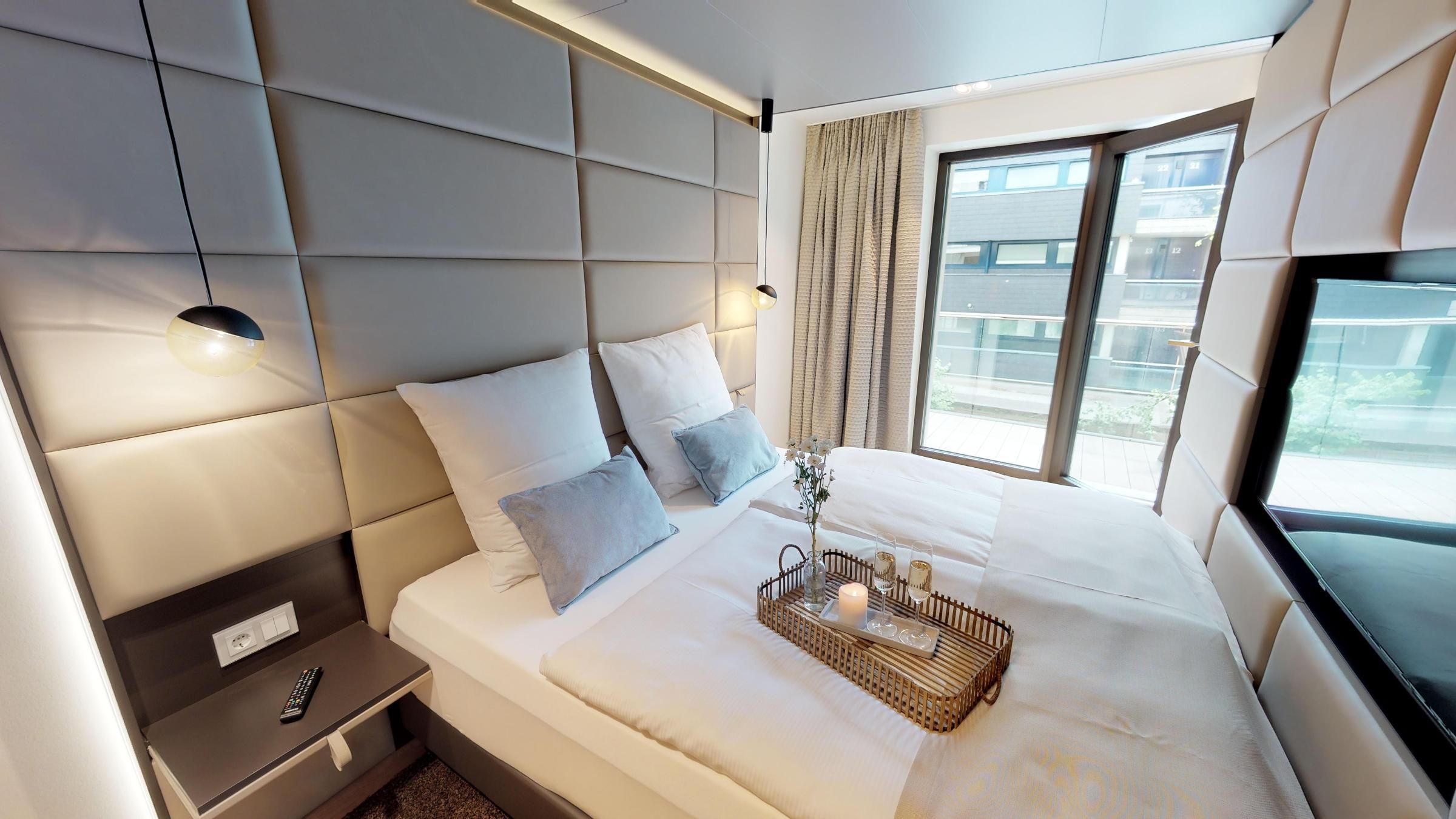 Sie erwartet eine gut ausgestattete Küchenzeile mit einer Essecke im Wohnbereich. Des Weiteren gibt es ein modernes Bad mit Dusche. Der offene Wohn- und Essbereich wird durch ein Sofa und einen Sessel abgerundet. Das separate Schlafzimmer mit Boxspring-Doppelbett wird durch Lamellen-Schiebetüren abgetrennt.