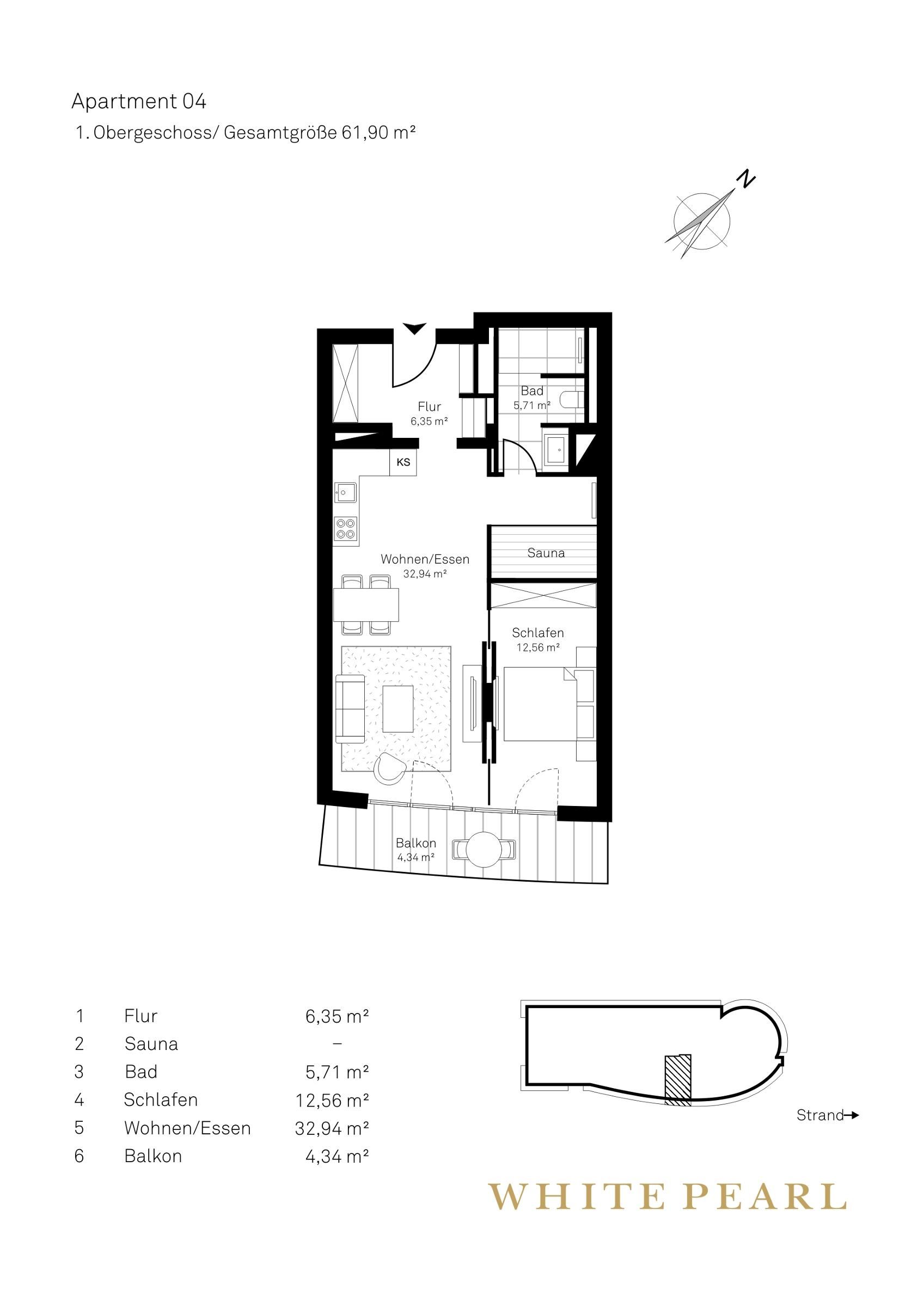 Nur wenige Gehminuten vom Strand entfernt befindet sich das Luxusapartment 1.04 im 1. Obergeschoss des "White Pearl" und bietet Platz für 2 Personen auf 62 m² - auch Ihr Hund ist willkommen!