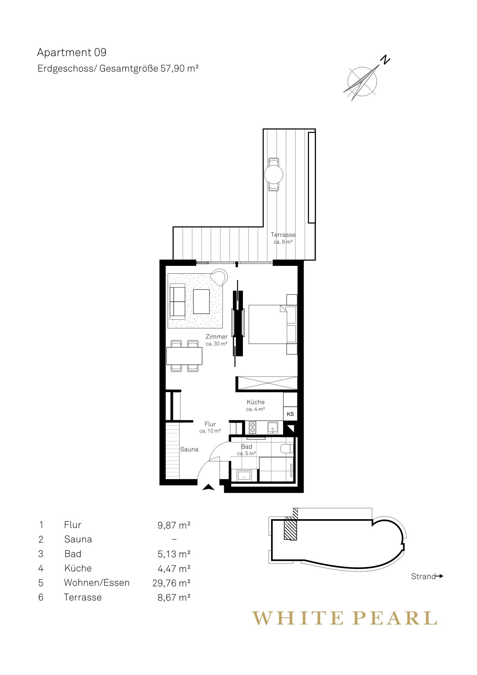 Das schöne Luxusapartment 0.09 befindet sich im Erdgeschoss des "White Pearl" und bietet Platz für 4 Personen auf 58 m² mit einem offenen Schlafzimmer und einer Schlafcouch im Wohnbereich. Auch Ihr Hund ist willkommen!