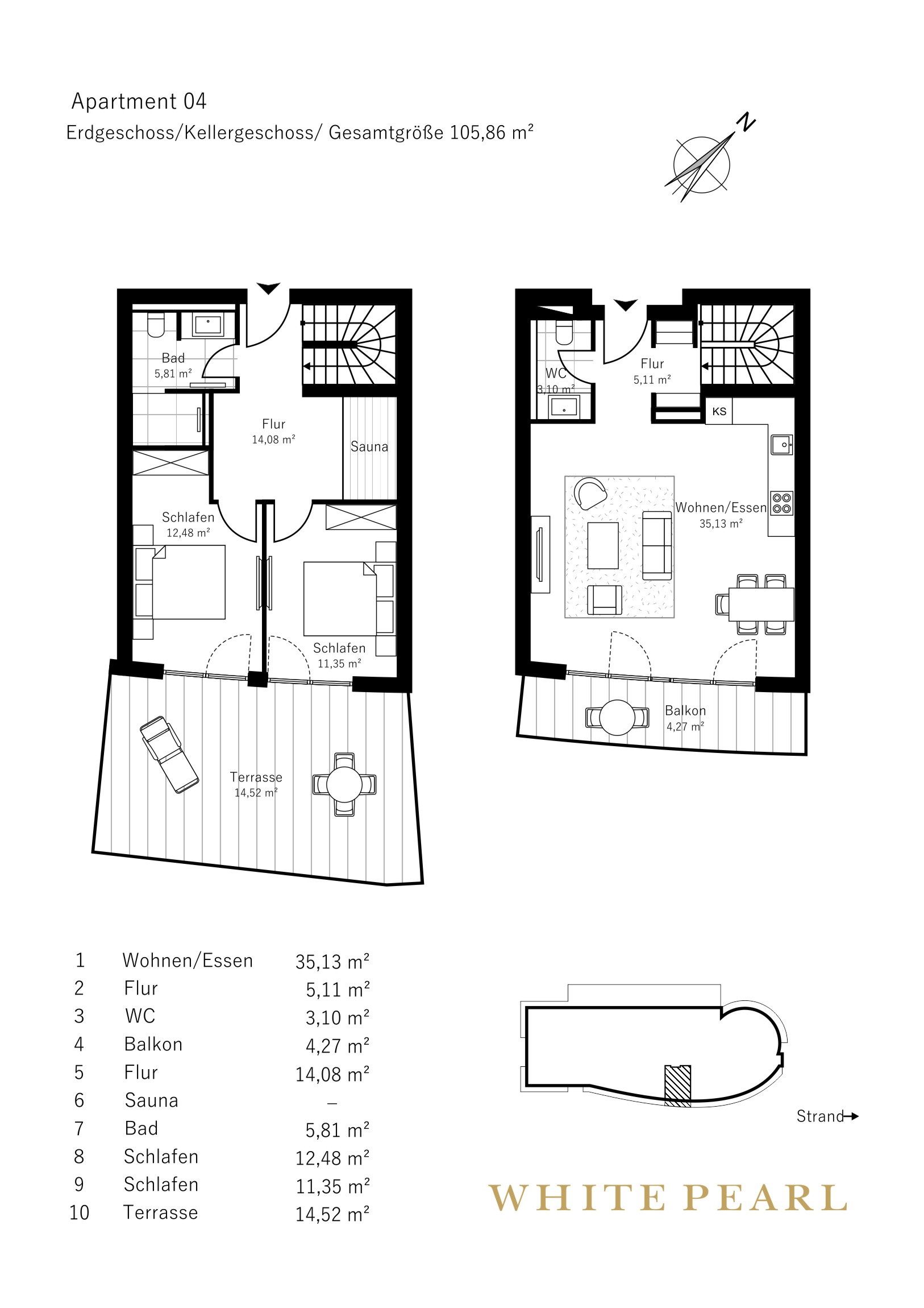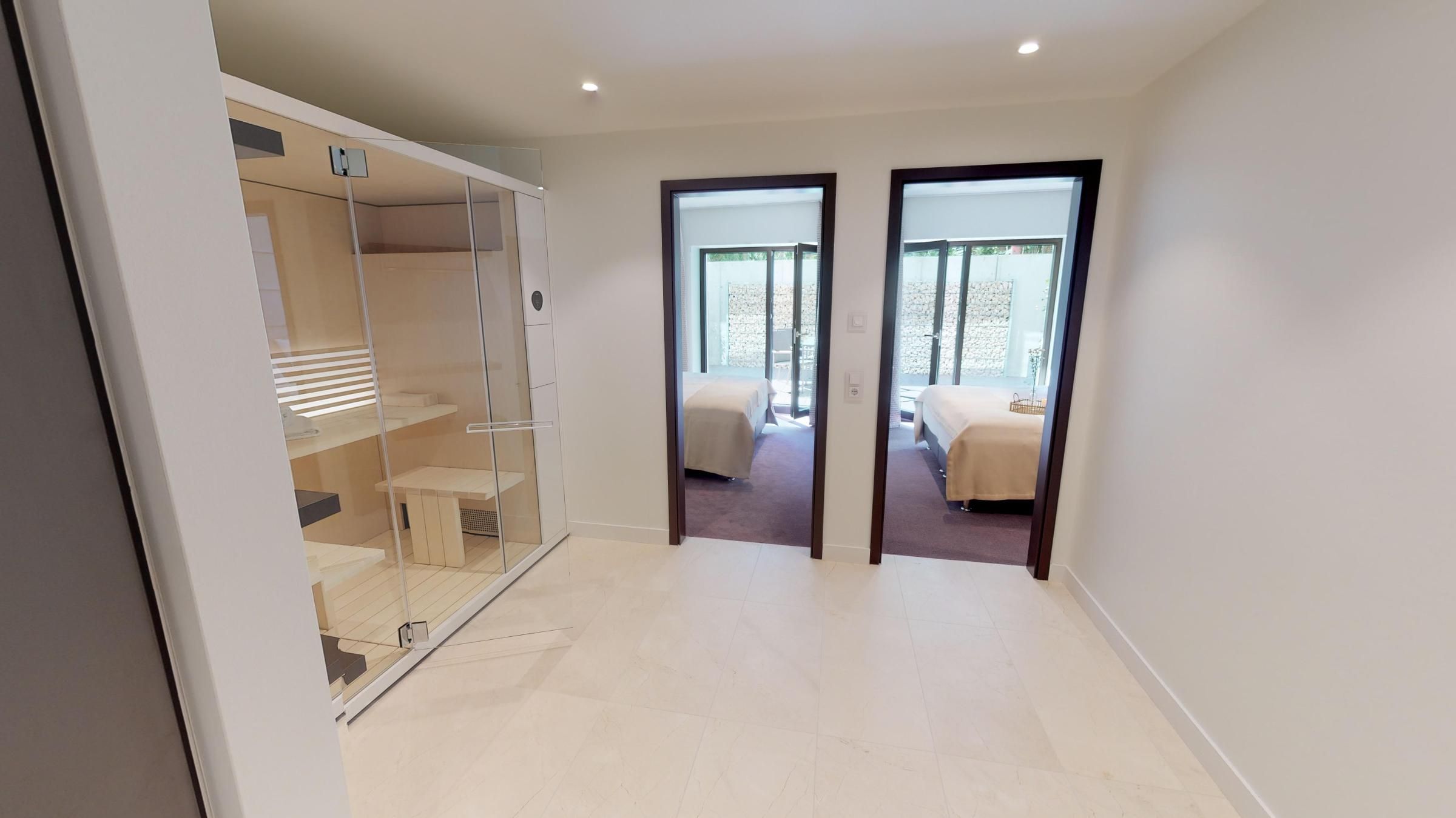 Im Untergeschoss befinden sich zwei Schlafzimmer mit Boxspring-Doppelbetten - beide Schlafzimmer haben Zugang zur großen, möblierten Terrasse. Ergänzt wird das Untergeschoss durch ein modernes Badezimmer mit Dusche sowie eine eigene Sauna (2,37m × 1,19m) im Flur. Im Erdgeschoss erwartet Sie eine offene, gut ausgestattete Küchenzeile mit anschließender Essecke. Abgerundet wird der Wohnbereich durch ein gemütliches Sofa, das als weitere Schlafmöglichkeit dient, sowie Sessel. Des Weiteren gibt es ein Gäste-WC.