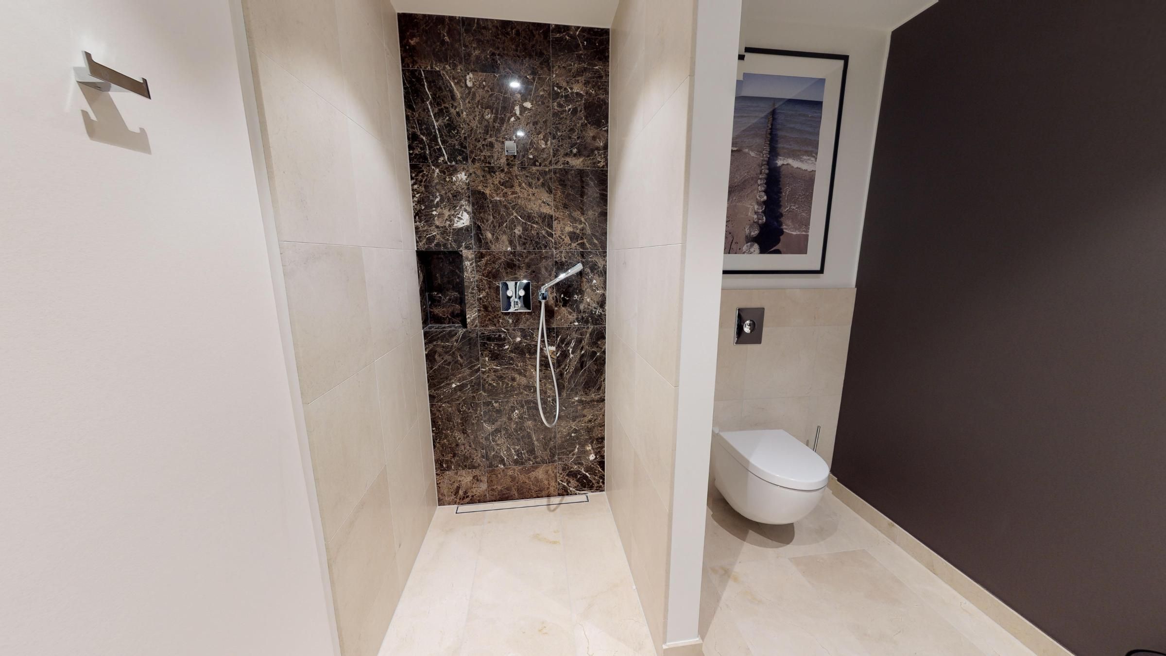 Im Untergeschoss befinden sich zwei Schlafzimmer mit Boxspring-Doppelbetten. Beide Schlafzimmer haben Zugang zur großen, möblierten Terrasse mit Sonnenliegen. Das Untergeschoss wird durch ein modernes Badezimmer mit Dusche und eine eigene kleine Sauna (1,17m x 1,17m) ergänzt.