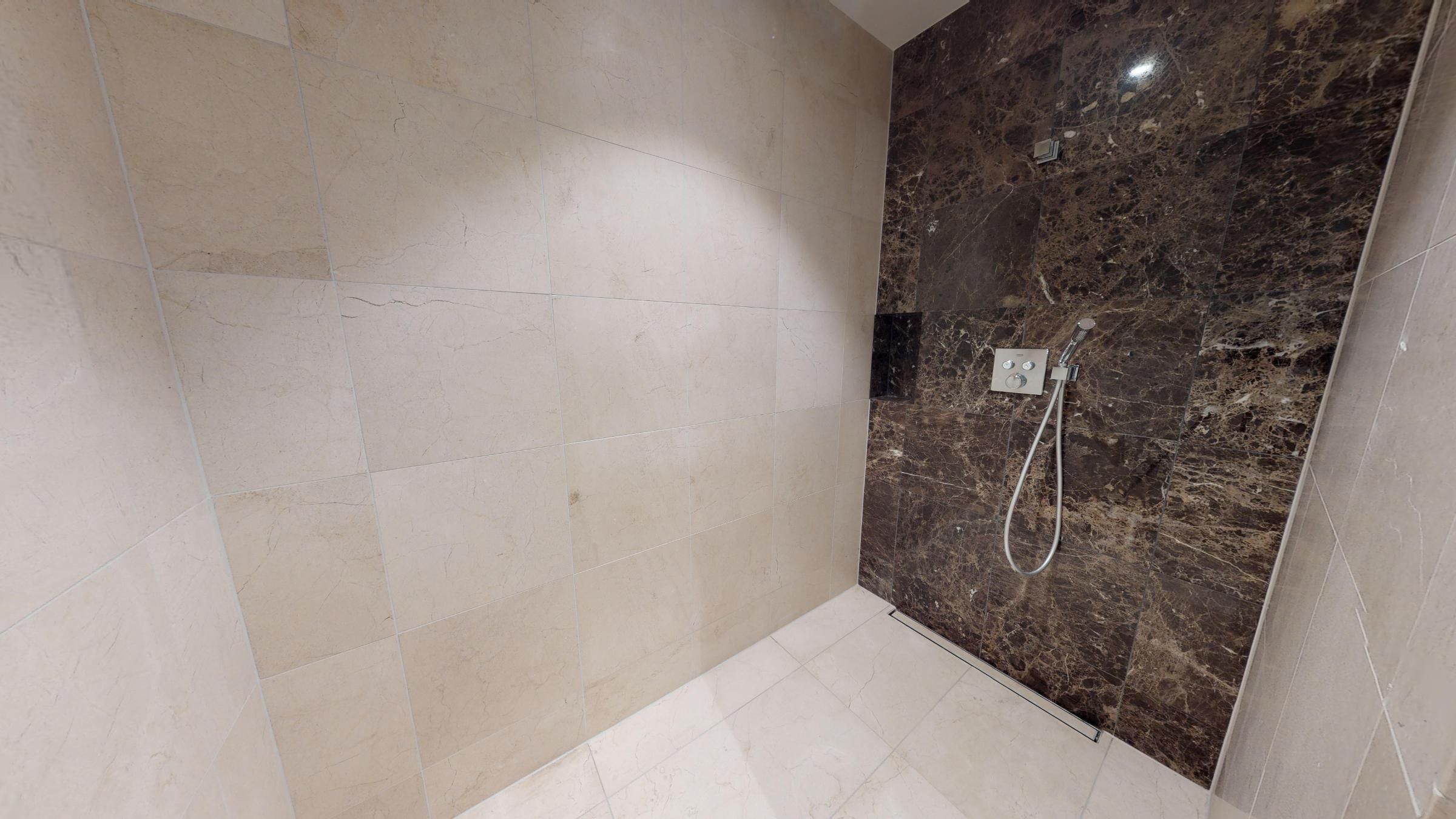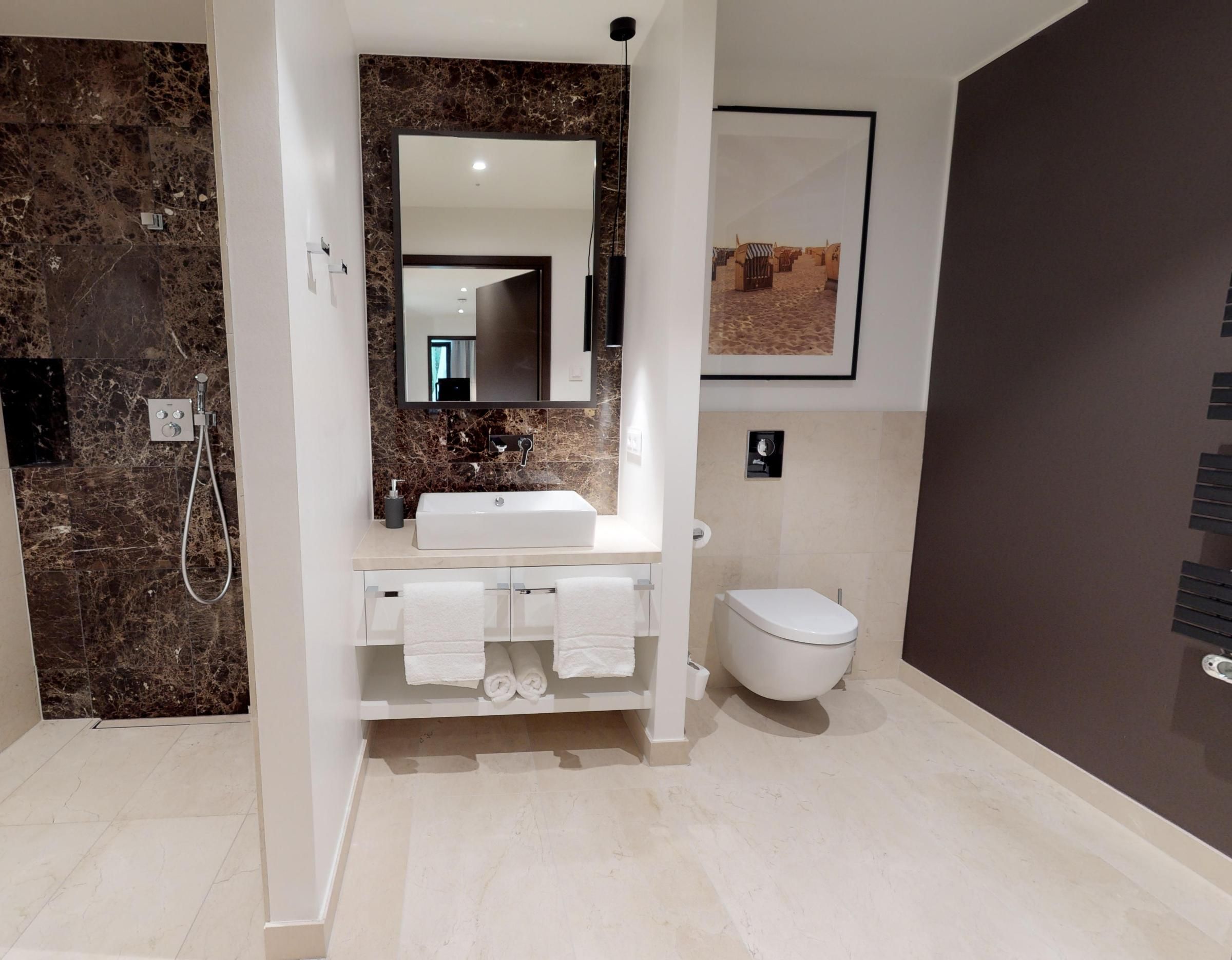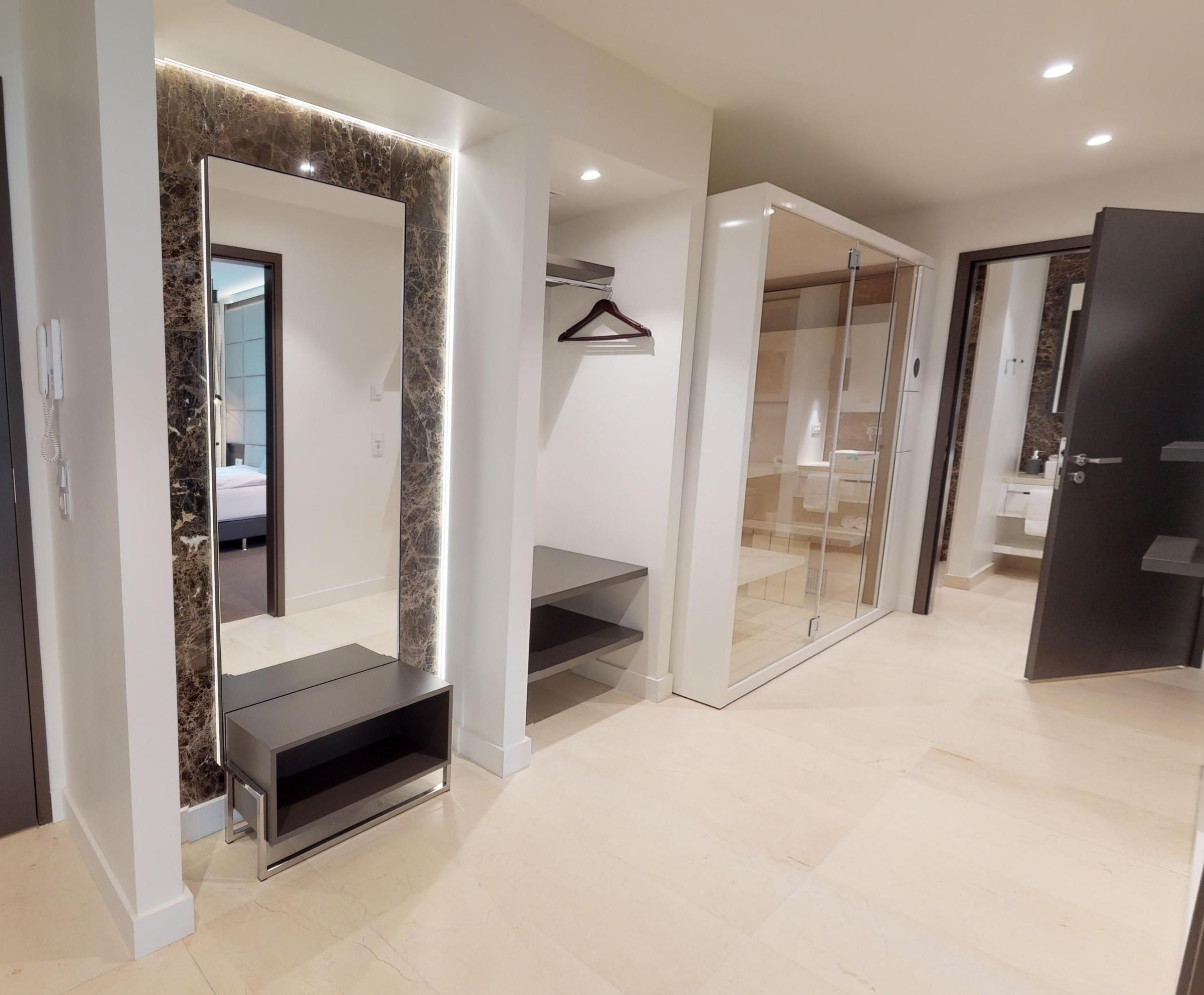Die Suite verfügt über eine offene und moderne Küchenzeile mit Qualitätsausstattung. Das moderne Naturstein-Marmor-Bad sowie die eigene Sauna mit Glasfront (2,37 x 1,19 m) runden die Suite ab.