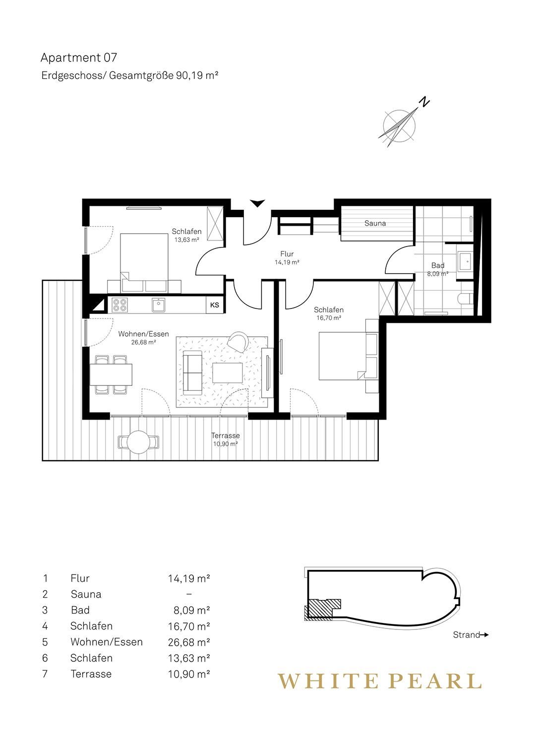 In 2. Reihe zum feinsandigen und kilometerlangen Strand befindet sich die Luxussuite 0.07 im Gartengeschoss des White Pearl. Sie bietet auf 90 m2 Platz für 4 Personen. Auch ihr Hund ist willkommen! Die 2 großzügigen Schlafzimmer verfügen jeweils über ein Boxspring-Doppelbett und ein 50“-TV. Sie bieten bei Bedarf Platz für Babybetten. Eines der beiden Schlafzimmer hat einen direkten Zugang zur Terrasse, das andere Waldblick.