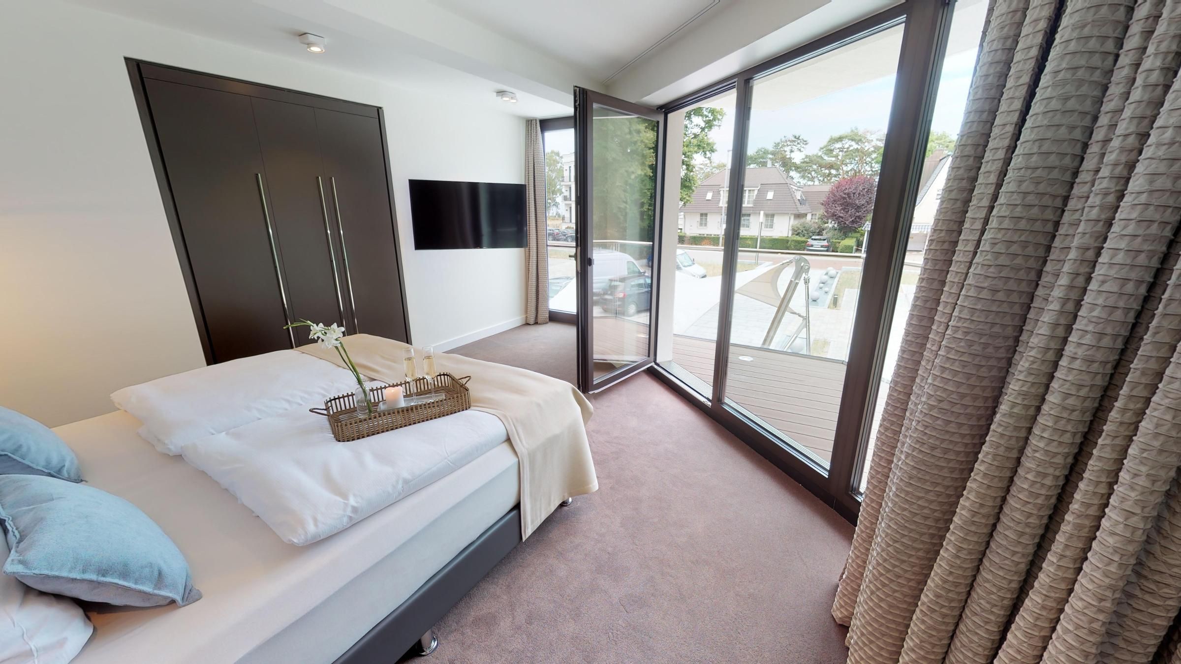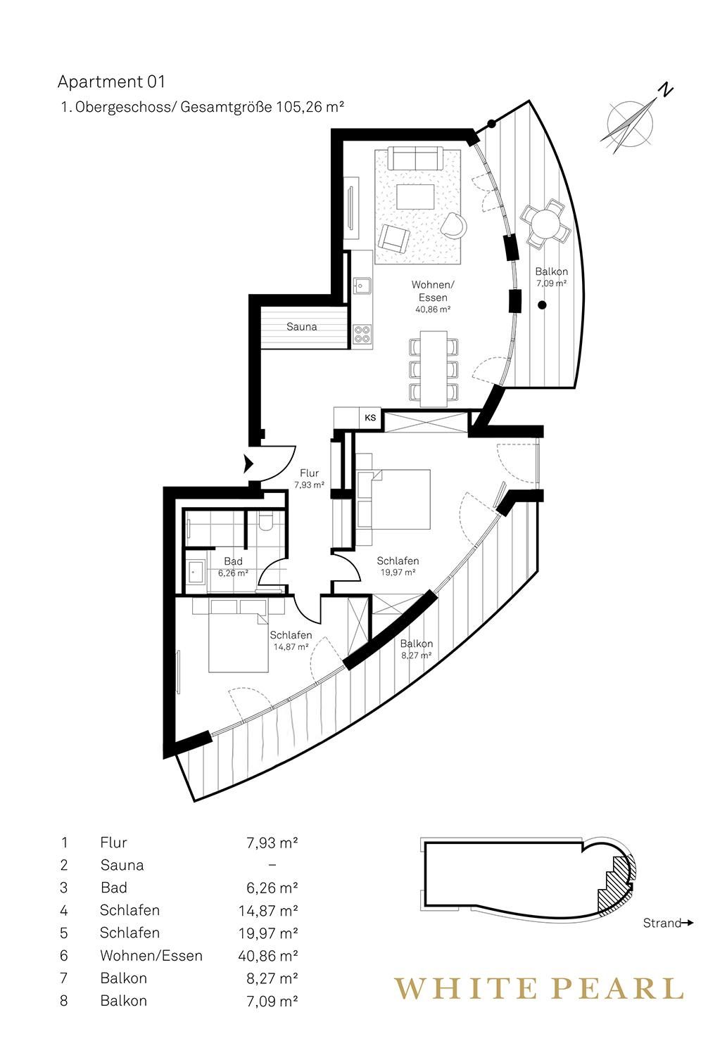Nur wenige Minuten vom Strand entfernt befindet sich die Luxussuite 1.01 im 1. Obergeschoss des "White Pearl" und bietet auf 105 m² Platz für 4 (+2) Personen – auch Ihr Hund ist willkommen. Die Suite verfügt über zwei separate Schlafzimmer sowie ein Schlafsofa im Wohnbereich für zwei Personen.