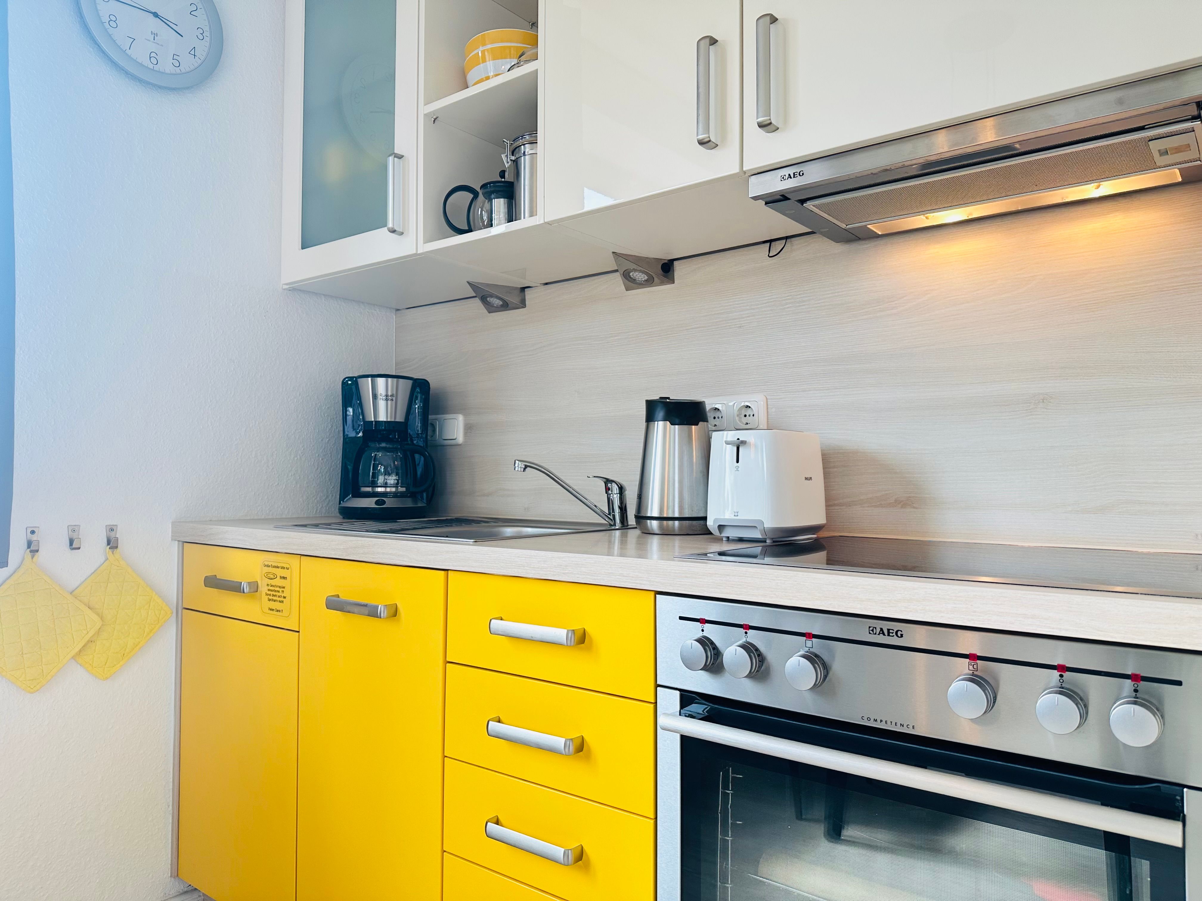 Der Wohnraum der Wohnung ist ansprechend gestaltet und verfügt über eine Essecke sowie eine offene Küche. Hier lädt eine behagliche Atmosphäre zum gemeinschaftlichen Kochen und Verweilen ein. Ein Flachbildfernseher sorgt für Unterhaltung.